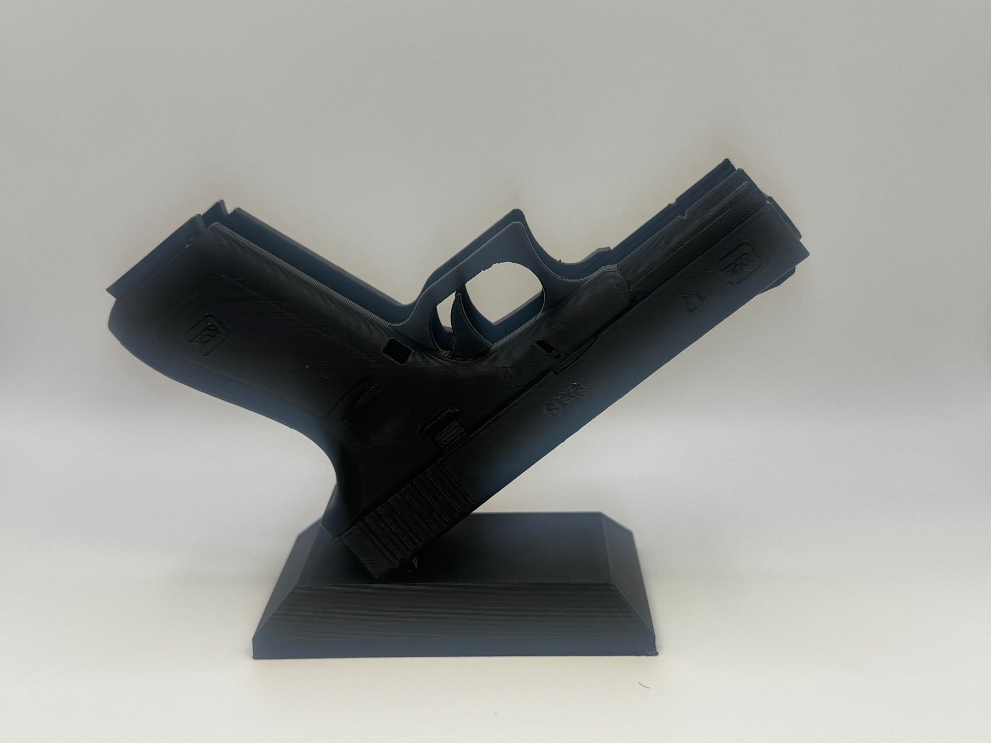Crafted with precision and finished in sleek black, this business card holder showcases the impressive detail and clean lines made possible through modern 3D printing. Its solid display base keeps your cards upright and easy to access, while the sculpted replica pistol adds personality and intrigue to any professional setting.